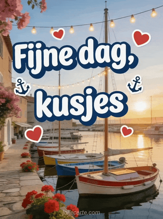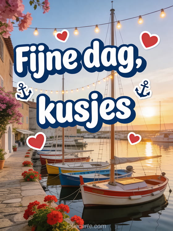 Verras iemand met deze warme fijne dag kaart met een pittoreske oude haven met gekleurde zeilboten en rode geraniums. Ontdek ook een gif fijne dag kus humor of een geanimeerde kaarten goedemorgen of fijne dag.