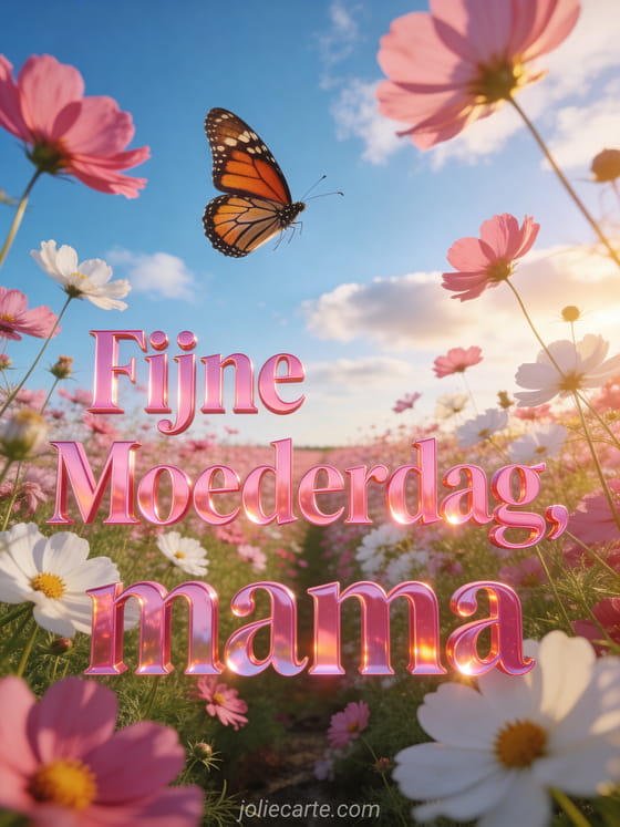 Deel deze mooie afbeeldingen fijne moederdag als kaart. Een veld van roze en witte kosmos dat zich uitstrekt tot de horizon onder een blauwe hemel met gouden middaglicht en een monarchvlinder in vlucht. Ontdek ook moederdag foto's gratis of afbeeldingen voor Moederdag.