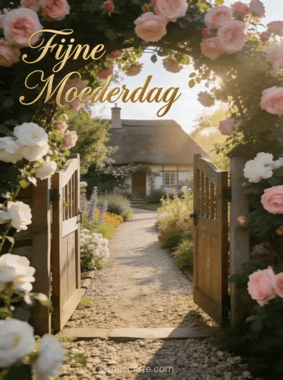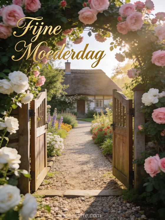 Vier moederdag met een lieve boodschap in een idyllische tuin vol rozen en ochtendlicht. Bekijk ook moederdag clipart, kleine lieve woordjes voor moederdag en een kaart maken voor moederdag.