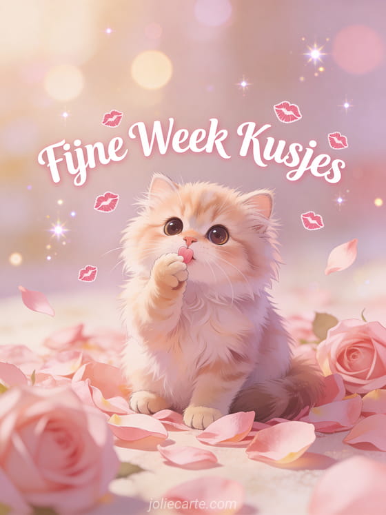 Stuur een adorable afbeeldingen fijne week kusjes kaart met een pluizig Perzisch kitten dat luchtkusjes geeft tussen roze rozenblaadjes in een liefdevolle en schattige sfeer. Ontdek ook een grappig fijne week humor kaart of een een fijne week kaart of een goedemorgen en fijne week kaart.