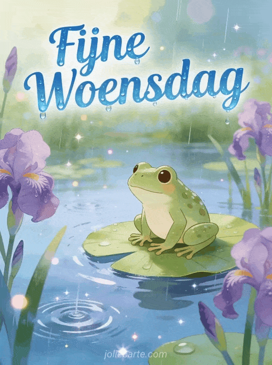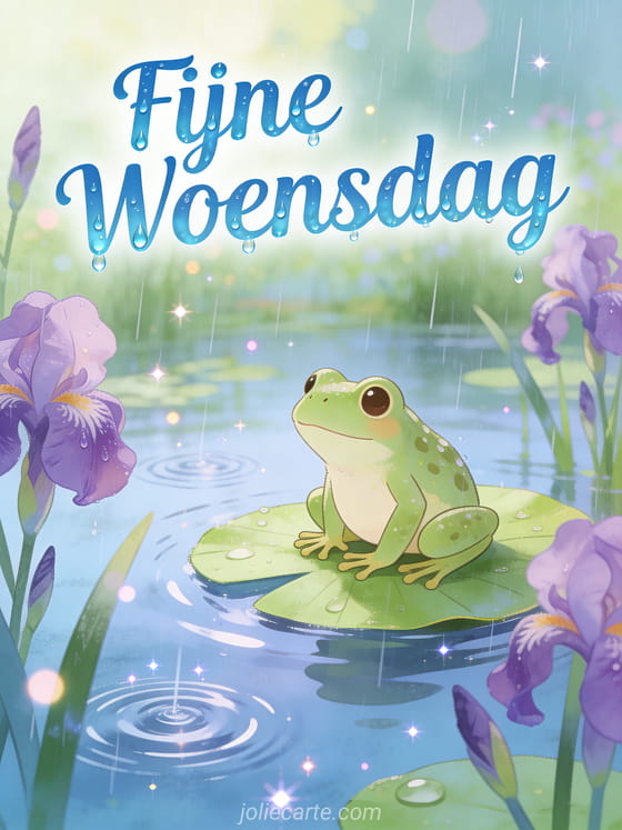 Deel een vredig regenachtige woensdag met deze schattige kikker-op-waterlelie-kaart. Ontdek ook een fijne woensdag paarden kaart or een lekker woensdag koffietje kaart.