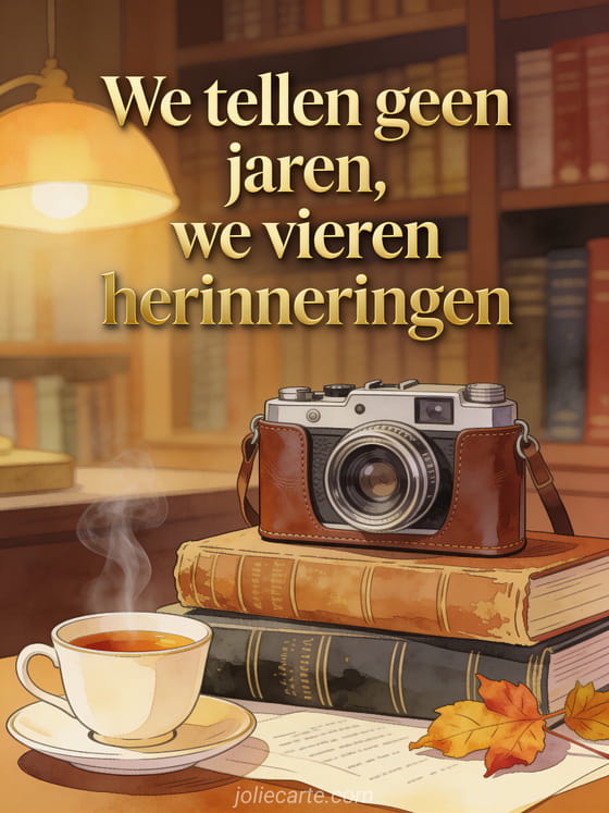 Een vintage leren fototoestel op een stapel oude gebonden boeken met een dampende theekan en herfsttbladeren bij warme bibliotheekverlichting. Bekijk ook gif verjaardag man humor of gefeliciteerd man humor verjaardag.