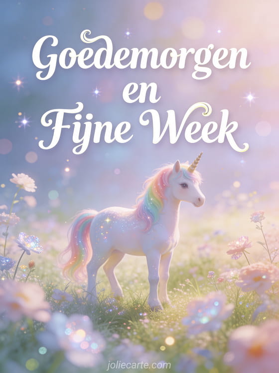 Deel een vleugje magie met deze goedemorgen en fijne week kaart met een dromerige eenhoorn in een glinsterende weide. Ontdek ook een kaart van fijne week grappig geanimeerd of fijne week motivatie.