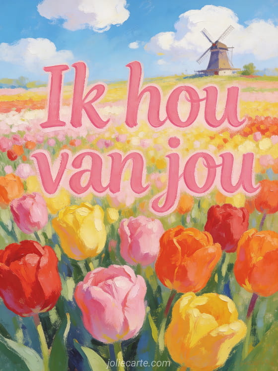 Deel je liefde met deze prachtige kleurrijke tulpenkaart. Bekijk ook liefdesbericht voor haar ik hou van je of ik hou van je geanimeerde gif.