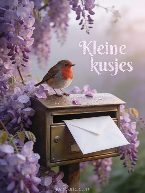 Stuur kleine kusjes met deze tedere kaart van een roodborstje op een vintage brievenbus omhangen met blauwe regen. Bekijk ook gif kusjes kusjes of schattige afbeelding kusjes.
