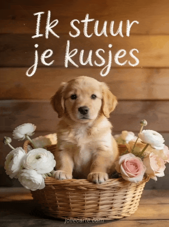 Stuur kusjes met deze schattige afbeelding van een golden retriever puppy in een rieten mand omringd door witte en roze ranonkels. Bekijk ook kusjes op afstand sturen of afbeeldingen kleine kusjes.