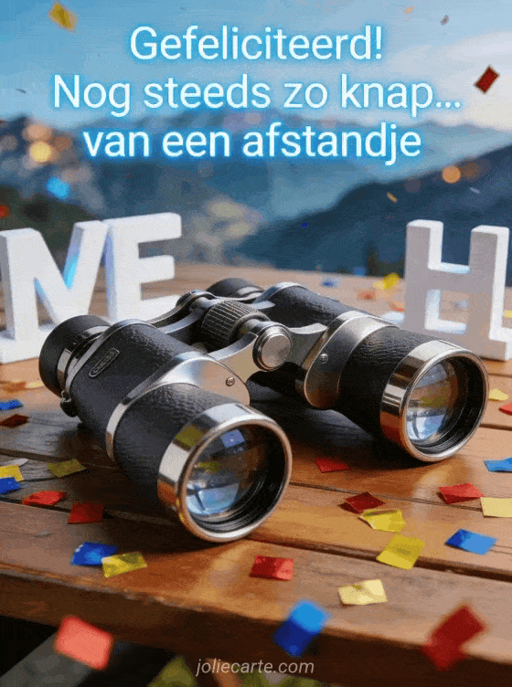 Deel deze humoristische kaart met een verrekijker, verspreide confetti en een vage bergachtergrond voor een speelse knipoog. Bekijk ook grappig verjaardagsbericht, man gif verjaardag humor en grappig gefeliciteerd met je verjaardag.
