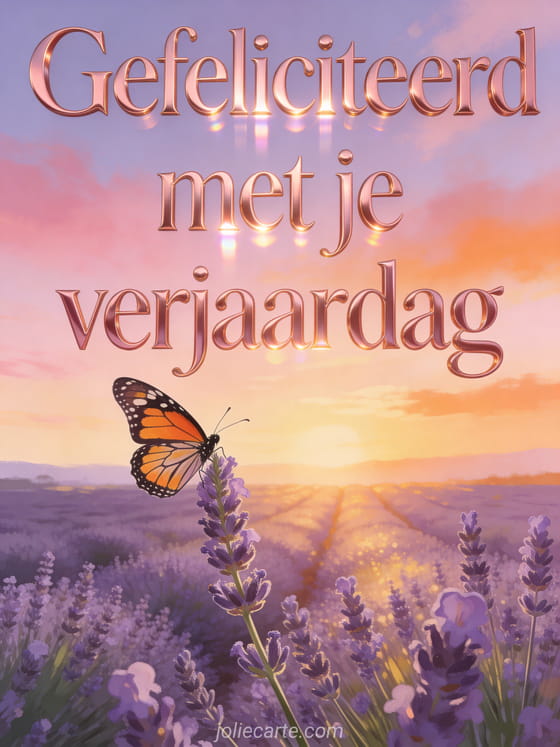 Verras een vrouw met deze serene verjaardagskaart met een lavendelveld bij zonsondergang en een prachtige monarchvlinder. Ontdek ook een gefeliciteerd verjaardagskaart vrouw of een gelukkige verjaardag mooie dame.