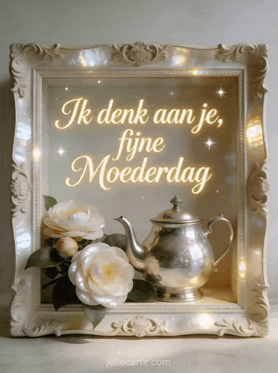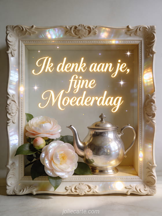 Deel een oprechte Moederdagkaart met een zilveren theepot, verse camelia's, sierlijke details en lichtgevende lentereflecties. Ontdek ook een foto voor Moederdag, Moederdag rijmgedichten of woorden voor Moederdag.