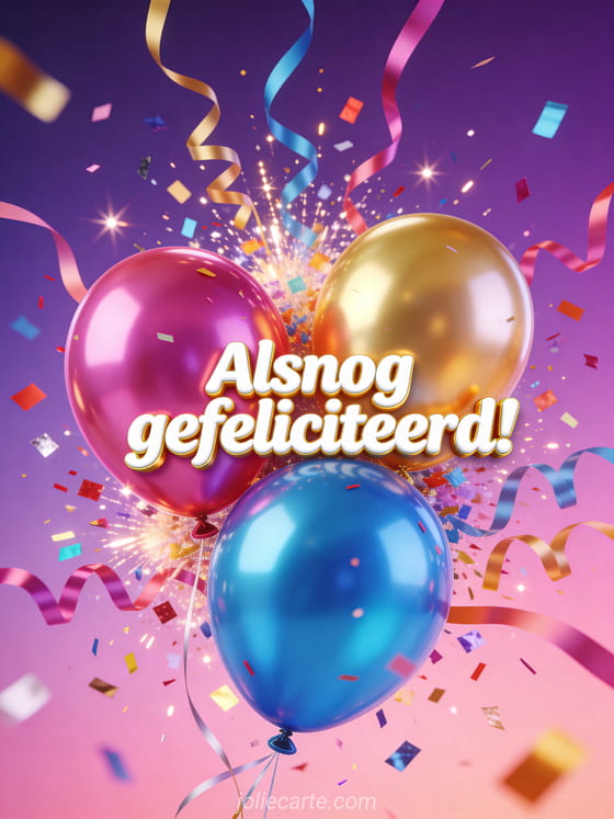 Met kleurrijke confetti, serpentines en glanzende ballonnen zegt deze feestelijke kaart het alsnog. Bekijk ook gefeliciteerd met vertraging humor.
