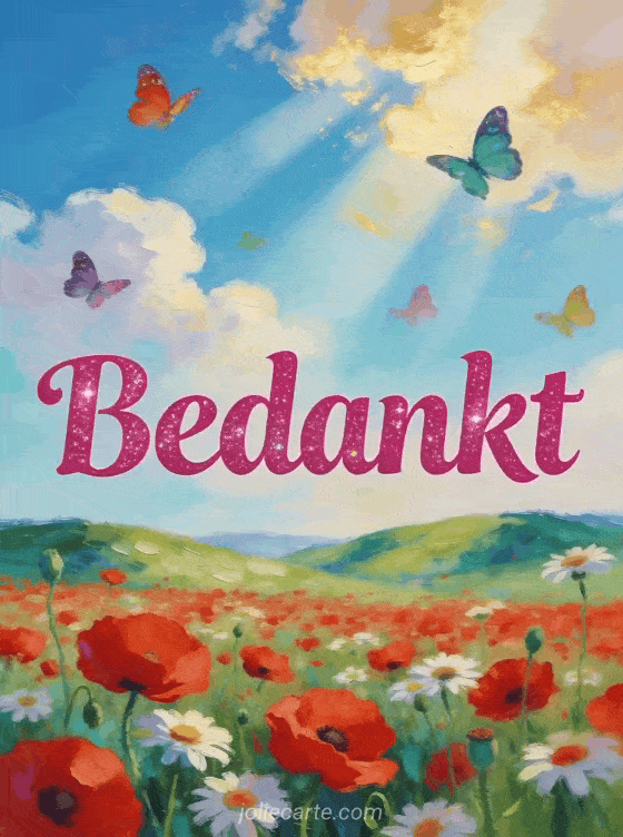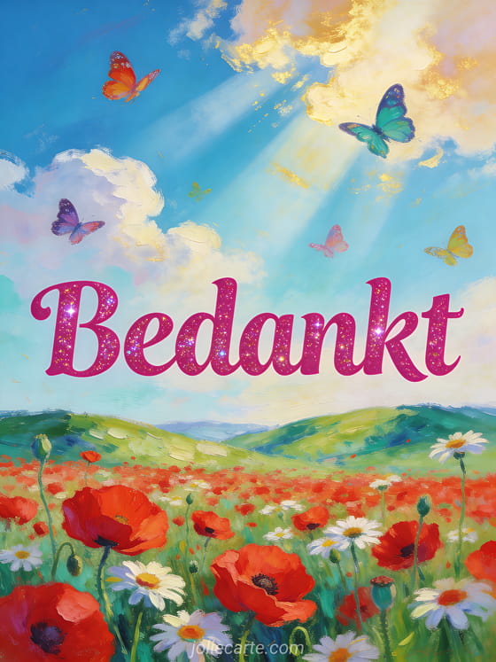 Stuur een stralende bedankt afbeelding met klaprozen en margrieten in een zomerse weide. Bekijk ook een bedankt voor uw antwoord of een heel erg bedankt kaart.