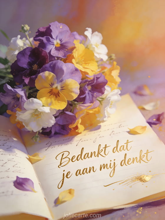 Bedankt dat je aan mij denkt een poëtische bedankkaart met viooltjes en een handgeschreven brief