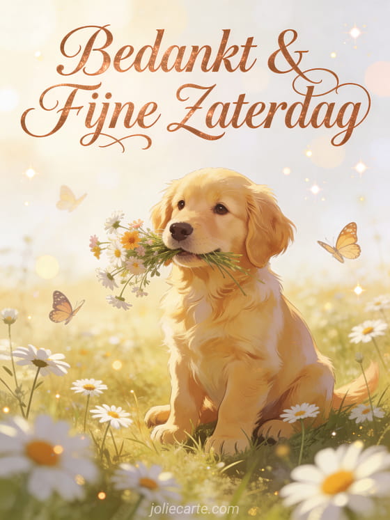 Deel dankbaarheid en weekendvreugde met deze bedankt en fijne zaterdag kaart met een dankbare Golden Retriever pup die veldbloemen vasthoudt op een zonnige weide. Ontdek ook een kaart van afbeelding fijne zaterdag kat of mooie zaterdag en fijn weekend.