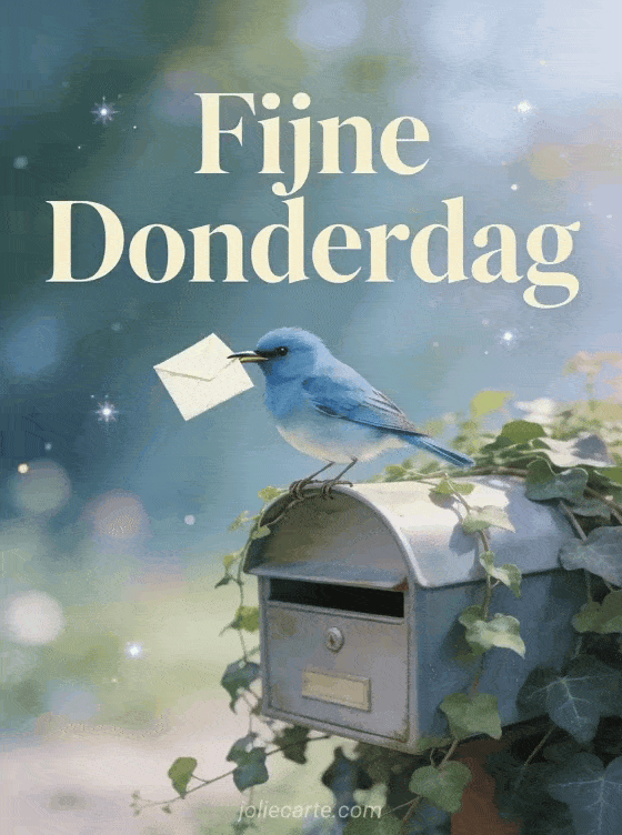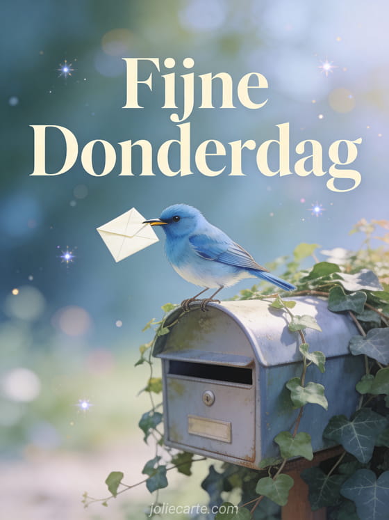 Stuur een hartelijk fijne donderdag bericht met een charmante blauwe vogel met een brief in zijn snavel op een brievenbus bedekt met klimop. Ontdek ook een ik wens je een fijne donderdag kaart of een fijne donderdag minion gif.
