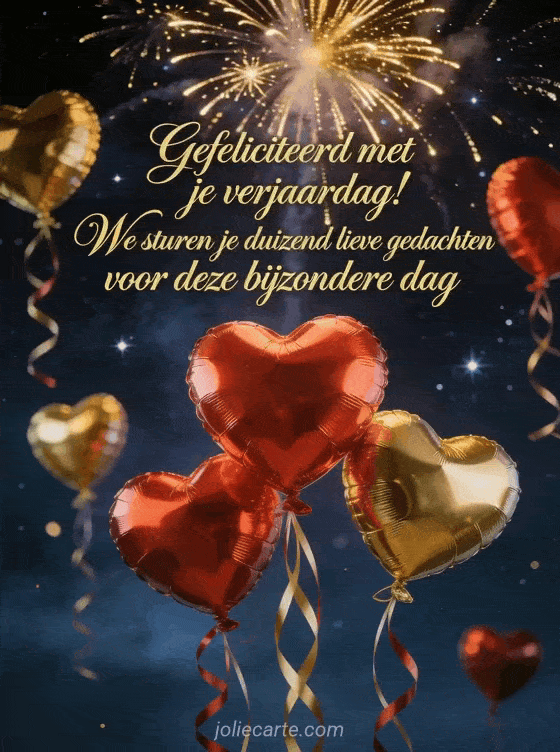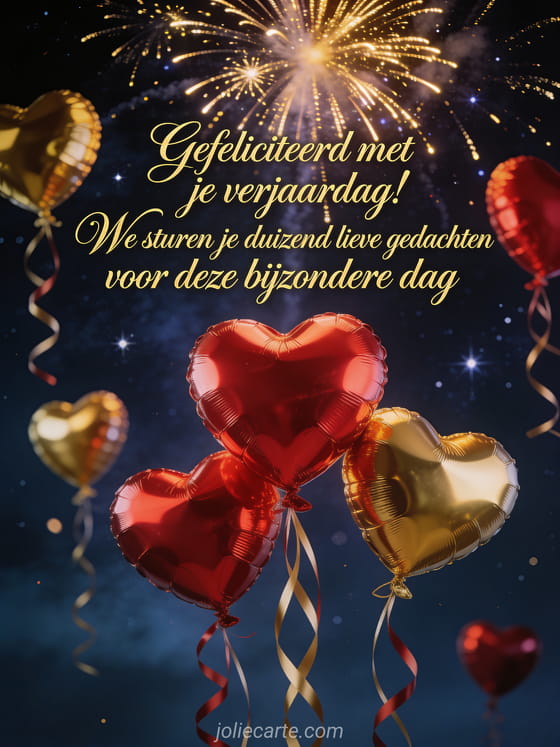 Stuur een prachtig bericht voor een gelukkige verjaardag met ballonnen en vuurwerk. Een warme en feestelijke gratis verjaardagskaart voor een bijzondere dag.