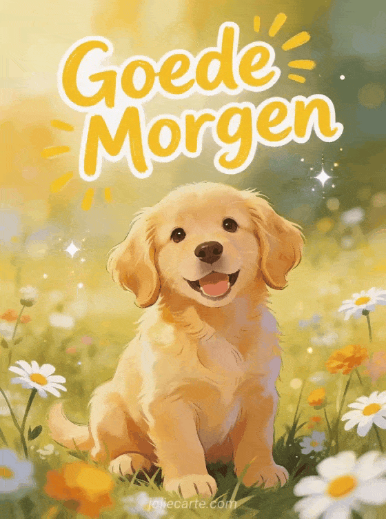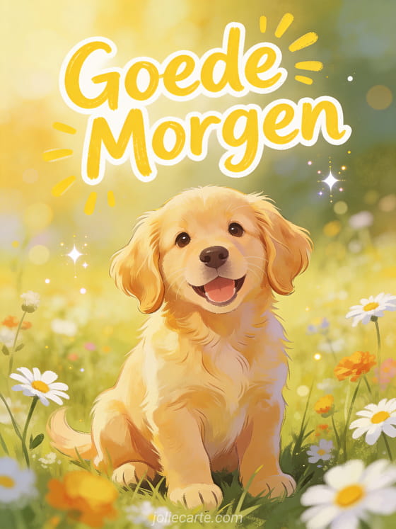 Stuur een vrolijk bericht goede morgen met een schattige golden retriever puppy met flaporen in een zonnige weide vol wilde bloemen en madeliefjes. Ontdek ook een goede morgen bloemen kaart of een goede morgen geanimeerd kaart of een goede morgen humor kaart.