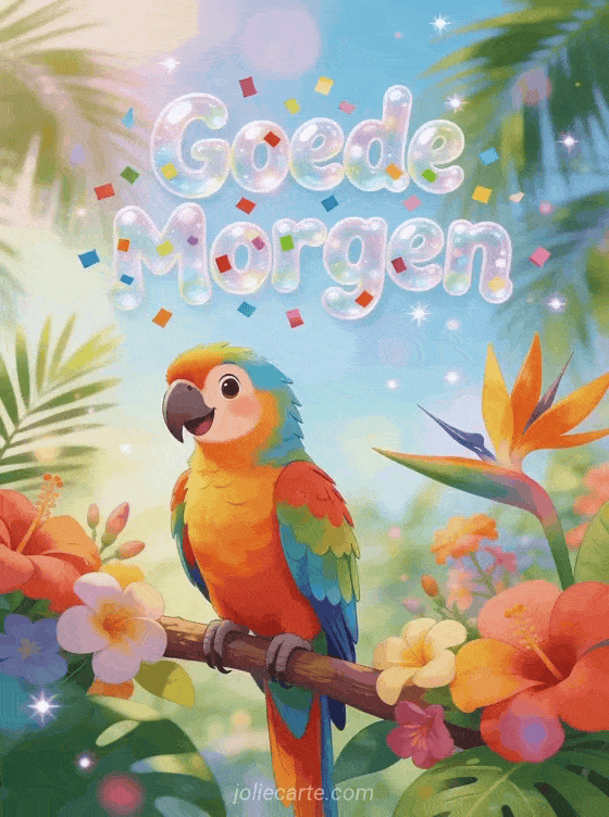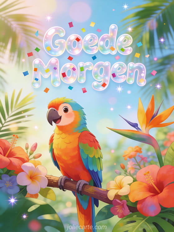 Stuur een exotische bericht goede morgen kaart met een vrolijke papegaai met prachtig kleurrijke veren op een tropische tak met exotische bloemen en palmbladeren in een levendige sfeer. Ontdek ook een goede morgen citaat kaart of een goede morgen schat kaart of een ik wens jullie een goede morgen kaart.