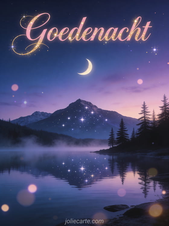 Stuur een serene goedenacht bericht via deze gratis wenskaart. Een majestueus bergmeer dat duizend sterren en de wassende maan weerspiegelt, silhouetten van dennenbomen op de oever, nevel die zachtjes opstijgt van het stille wateroppervlak. Bekijk ook een kaart om goedenacht te wensen of een afbeelding fijne avond en goedenacht kussen gif.