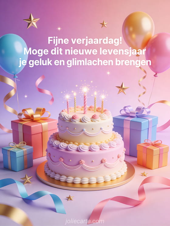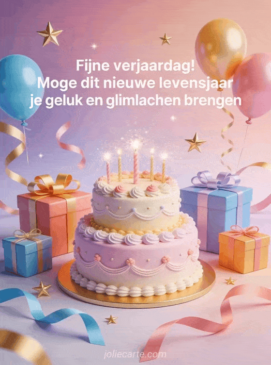 Stuur een bericht om een fijne verjaardag te wensen met een verfijnde kaart van taart, cadeaus, ballonnen en fonkelende sterren. Bekijk ook tekst voor verjaardag, tekst verjaardagskaart en verjaardagsbericht.