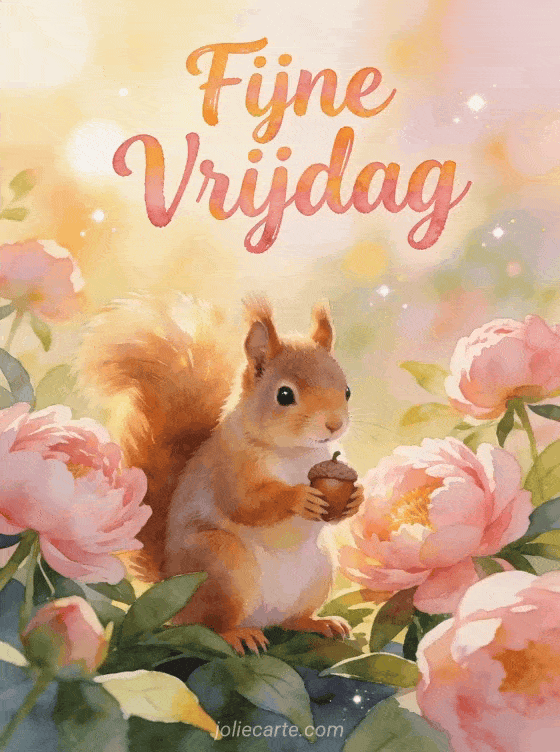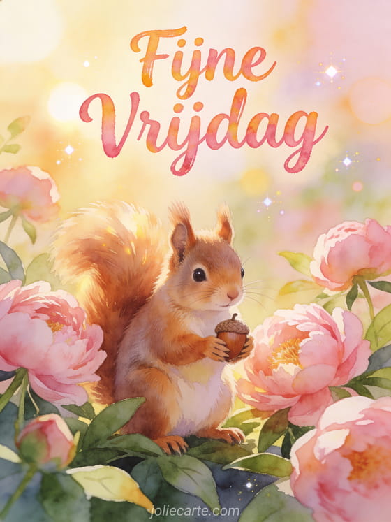 Stuur een vrolijk vrijdagbericht met een schattige eekhoorn met een eikel, zittend tussen prachtige roze pioenrozen. Bekijk ook een fijne vrijdagdag humor of een afbeelding goedemorgen vrijdag humor.