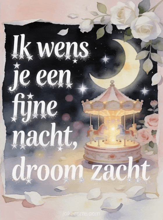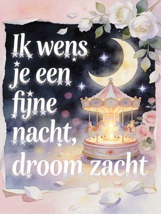 Deel een zacht bericht voor een fijne nacht met fonkelende sterren, witte rozenblaadjes en een carrousel-muziekdoos onder een maansikkel. Ontdek ook welterusten bericht, kort bericht om welterusten te zeggen of mooi goedenacht berichtje.
