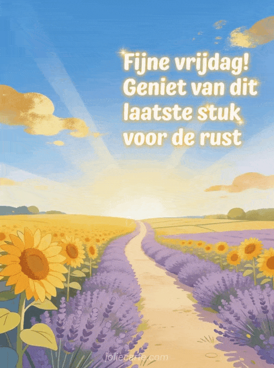 Wens een fijne vrijdag met een lentelandweg langs zonnebloemen en lavendel, richting een heldere en optimistische horizon. Ontdek ook fijne vrijdag gratis afbeeldingen, fijne vrijdag dikke kusjes of goedemorgen vrijdag humor.