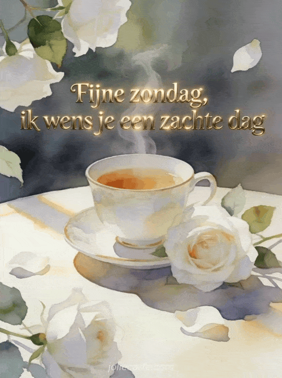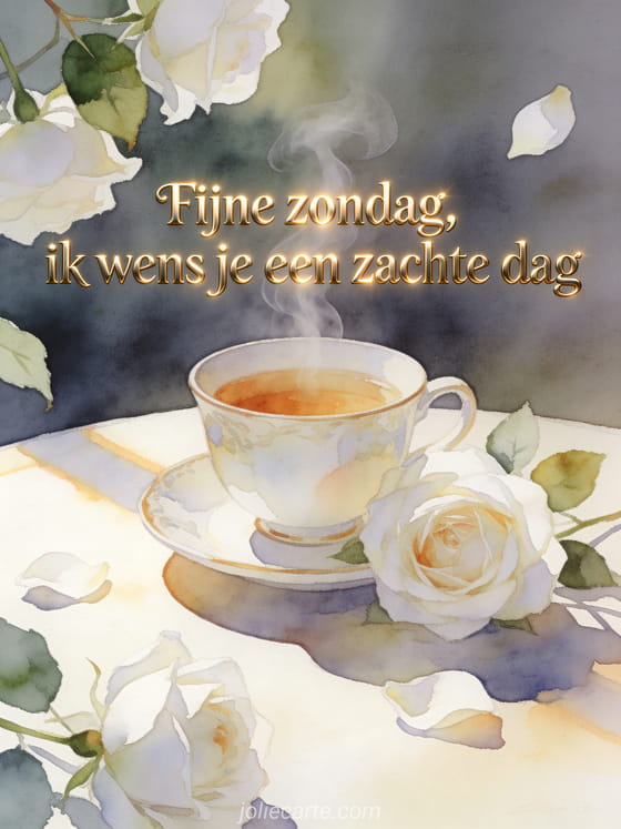 Geef een zacht bericht voor fijne zondag met een fijn theekopje, witte rozen en warm aquarellicht. Bekijk ook gratis fijne zondag afbeelding, fijne zondag zon gif of fijne zondag met koffie afbeelding.