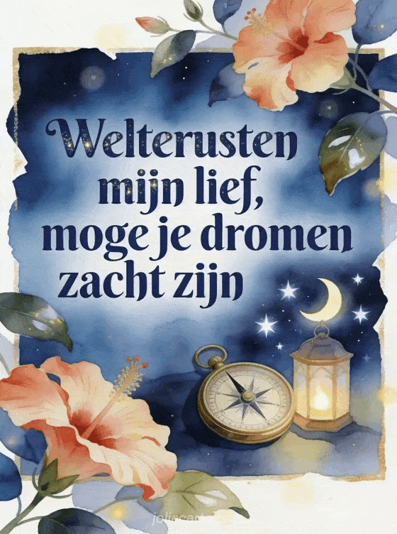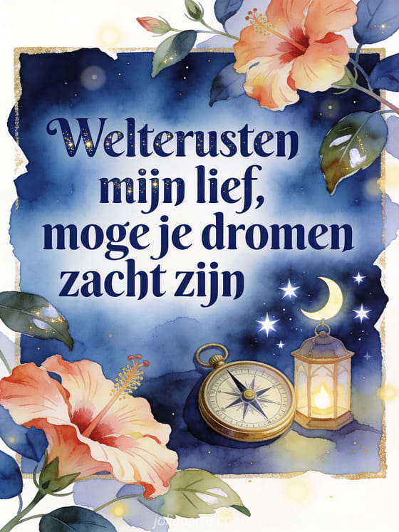 Wens welterusten met een vintage kompas, een kleine maanlantaarn, heldere sterren en hibiscusblaadjes in een kalme aquarelnachtgloed. Je kunt ook het mooiste welterusten bericht, een gratis virtuele goedenacht kaart of een welterusten kusjes kaart sturen.