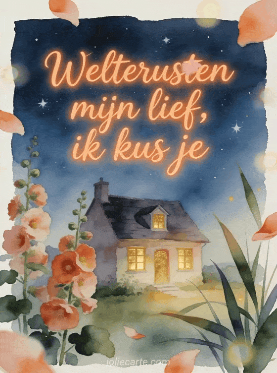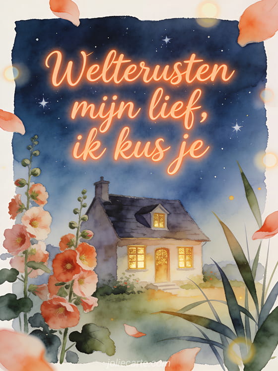 Stuur een liefdevol welterustenbericht met koraalkleurige kalligrafie, een klein huis met gouden ramen, een sterrenhemel en stokrozen. Ontdek ook een virtuele geanimeerde welterusten kaart, een kaart om welterusten te zeggen of een geanimeerde welterusten kaart.