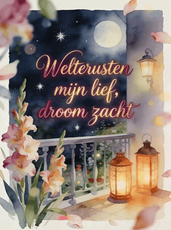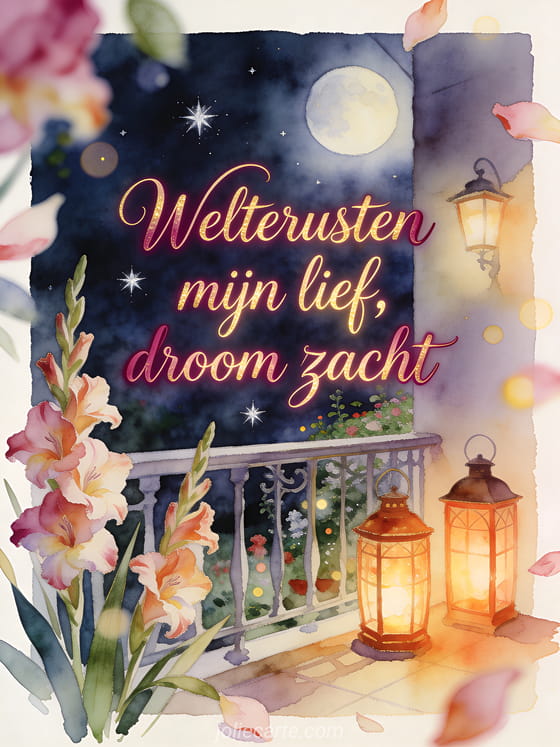 Stuur een romantisch welterustenbericht met een maanverlichte balkontuin, zilveren sterren, warme lantaarns en gladiolen in zacht aquarellicht. Bekijk ook een bericht om zijn vriendin welterusten te wensen, een gratis goedenacht kaart of een knap welterusten bericht.