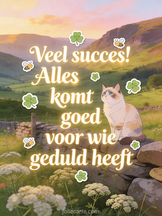 Stuur een warm bericht veel succes voor een wedstrijd met een Schotse Highlands landschap en een Turkse Van kat met klavertjes vier. Bekijk ook een hoe wens je iemand veel succes of een meme veel succes.