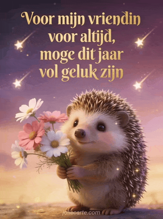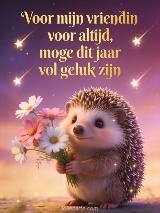 Een schattige egel met een boeket roze en witte kosmosbloemen bij vallende sterren in een schemerse paarse en gouden hemel. Bekijk ook verjaardag wens vriendin of verjaardag beste vriendin.