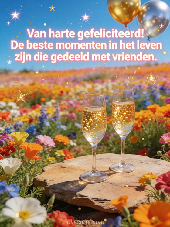 Verras een vriend met dit feestelijke verjaardagsbericht met een tapijt van wilde bloemen en champagneglazen. Ontdek ook een verjaardagskaart gefeliciteerd mijn vriendin of een verjaardagskaart gefeliciteerd vriendin.