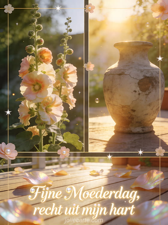 Deel een verzorgde Moederdagkaart met lichtgevende letters, hoge stokrozen, een zonnige stenen vaas, een helder terras en glinsterende bloemblaadjes. Ontdek ook een tekst over Moederdag, Moederdag berichten of een plaatje voor Moederdag.