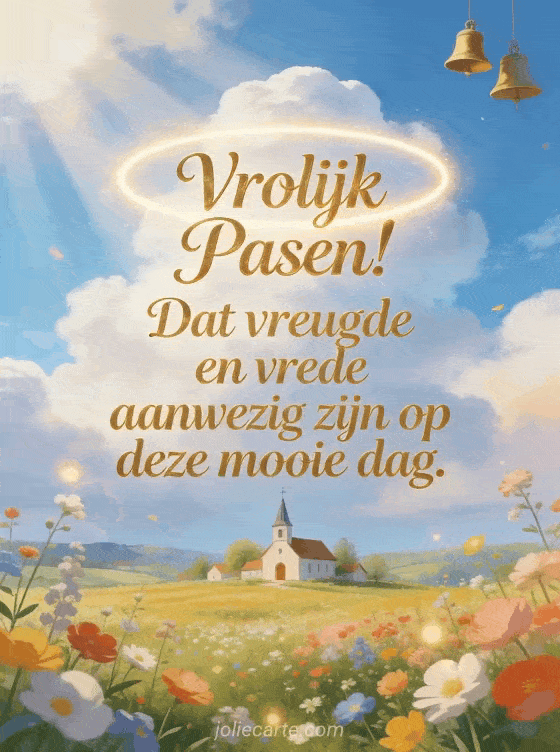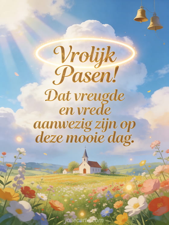 Stuur een warm bericht voor het paasfeest met een klein dorpskerkje omringd door lentebloemenvelden. Ontdek ook een bericht voor vrolijk pasen wensen of een pasen wensen kaart.