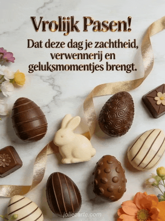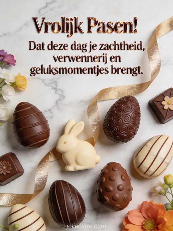 Stuur een warm Pasen-bericht met artisanale chocolades op marmer en verse bloemen. Ontdek ook een pasen wensen kaart of een vrolijk pasen wensen.