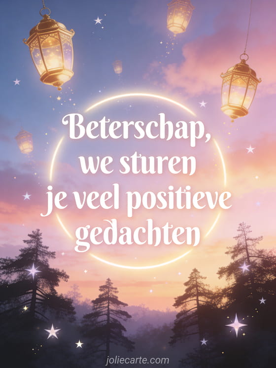 Stuur een sprookjesachtige kaart met gouden vliegende lantaarns in een schemerende pasteltintenhemel om iemand positieve gedachten en beterschap toe te wensen. Bekijk ook een tekst voor een spoedig beterschap, hart sterkte beterschap of veel sterkte en beterschap.
