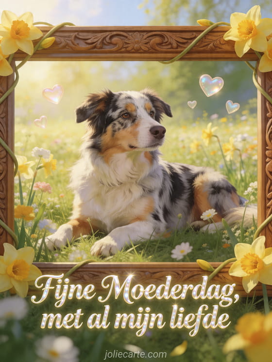 Deel een liefdevolle Moederdagkaart met een realistische Australische herder die rust in een bloeiende weide, omlijst door gesneden hout, narcissen en zwevende hartjes. Ontdek ook Moederdag poëzie kusjes, een Moederdagkaartje of een fijne Moederdag supermama.