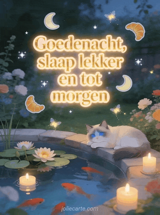 Stuur een vredig goedenacht berichtje met een ragdoll kat bij een vijver vol waterlelies, drijvende kaarsen en vuurvliegjes. Bekijk ook een goedenacht berichtje vriendschap of een kaart avondkusjes.