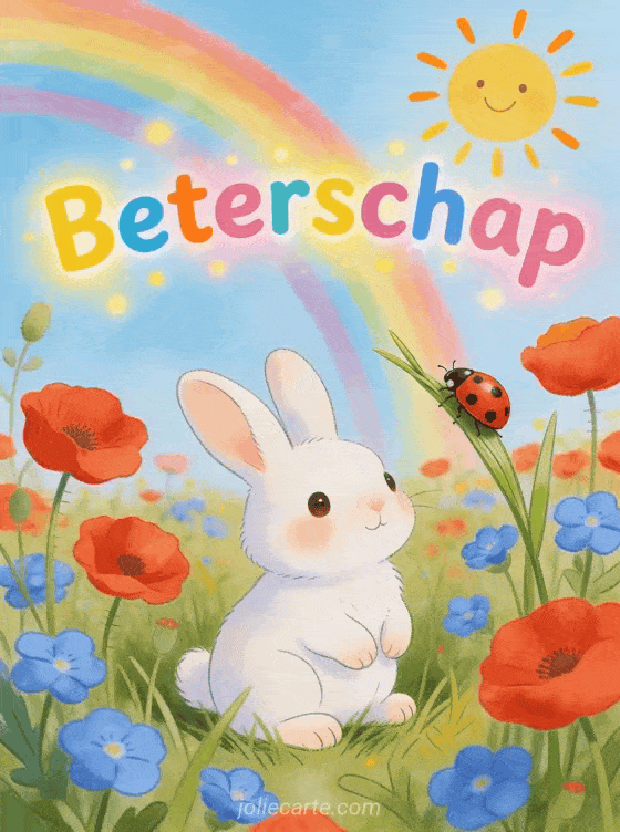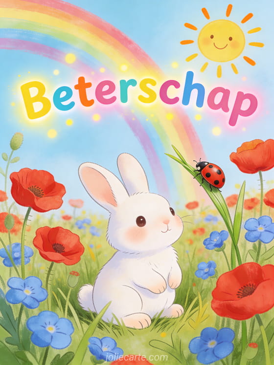 Stuur een kleurrijke en vrolijke kaart met een wit konijntje in een weide vol klaprozen en korenbloemen om een kind beterschap te wensen. Bekijk ook een sterkte beterschap man, bericht spoedig beterschap of ik wens je een spoedig beterschap.
