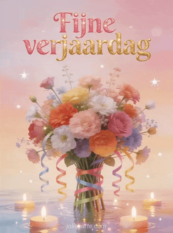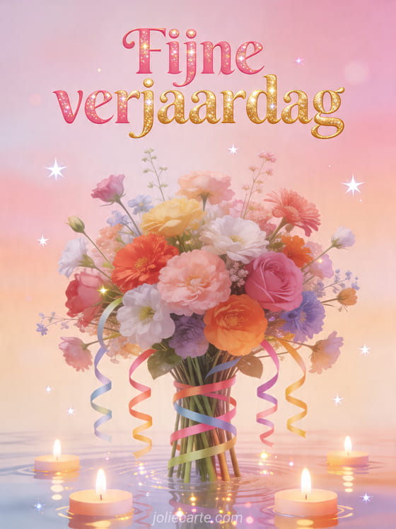 Deel een vrolijke verjaardagswens met deze delicate bloemenkaart met kleurrijke bloemen, zwevende kaarsen en fonkelende sterren op een pastelachtergrond. Ontdek ook bloemenboeket fijne verjaardag, gefeliciteerd met je verjaardag wensen op afstand en woorden om gefeliciteerd met je verjaardag te wensen.