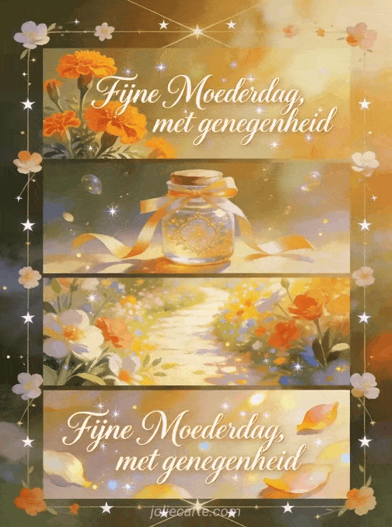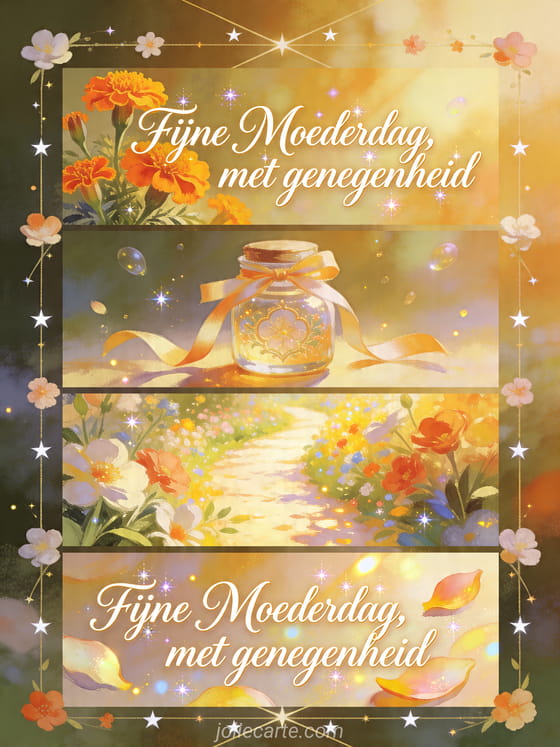 Deel een zonnige Moederdagkaart met geschilderde kalligrafie, afrikaantjes, een herinneringspot met lint, een helder bloemenpad en glinsterende bloemblaadjes. Ontdek ook een Moederdag citaat, fijne Moederdag schoonmoeder of Moederdag voor mijn dochter.