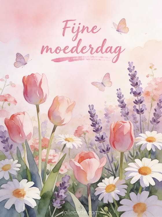 Verras mama met deze tedere aquarel bloemen moederdagkaart vol tulpen, lavendel en margrieten met vlinders in lentelicht. Bekijk ook moederdagkaarten of fijne moederdag.