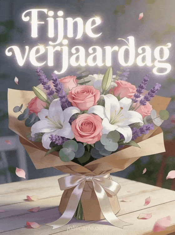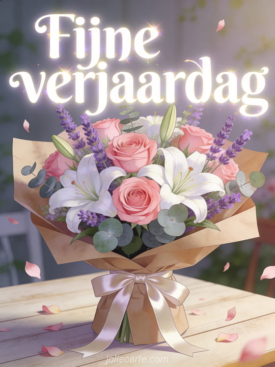 Deel een bloemenboeket fijne verjaardag kaart met roze rozen, witte lelies, lavendel en eucalyptus op een lichte houten tafel met warme natuurlijke lichtinval. Ontdek ook een fijne verjaardag, gefeliciteerd gif rood en heel fijne verjaardag.