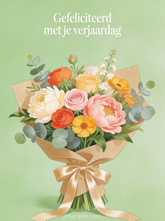 Stuur een elegante verjaardagsgroet met een prachtig gevarieerd bloemenboeket vol pioenrozen, rozen, ranonkels en eucalyptus, verpakt in kraft papier met een satijnen lint. Bekijk ook virtuele verjaardagskaart geanimeerd gratis of gefeliciteerd verjaardag vuurwerk geanimeerd.