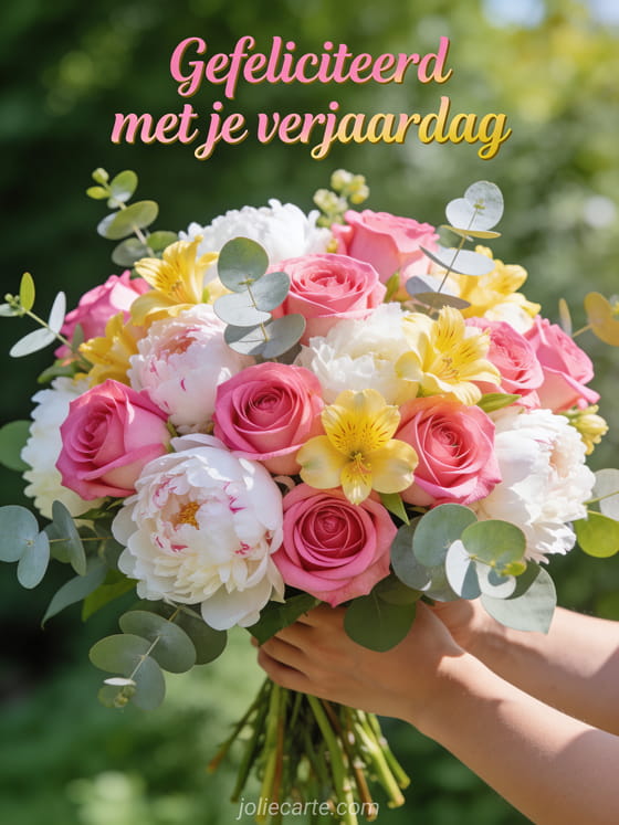 Een groot weelderig boeket met felroze rozen, witte pioenrozen, gele freesia's en eucalyptus in natuurlijk licht met groene achtergrond. Bekijk ook gefeliciteerd verjaardag vrouw humor of kaart gefeliciteerd verjaardag vrouw.