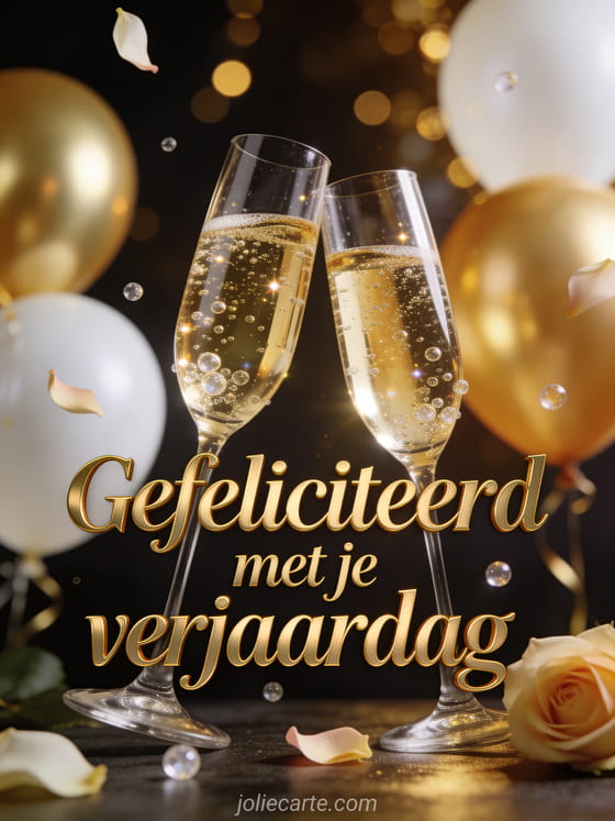 Proost op haar verjaardag met stijl. Twee champagne coupes klinken met glinsterende bubbels, gouden en witte ballonnen en vallende rozenblaadjes in warm feestelijk licht op een donkere achtergrond met gouden bokeh. Ontdek ook een gefeliciteerd boeket verjaardag vrouw of een gif gefeliciteerd verjaardag vrouw humor.
