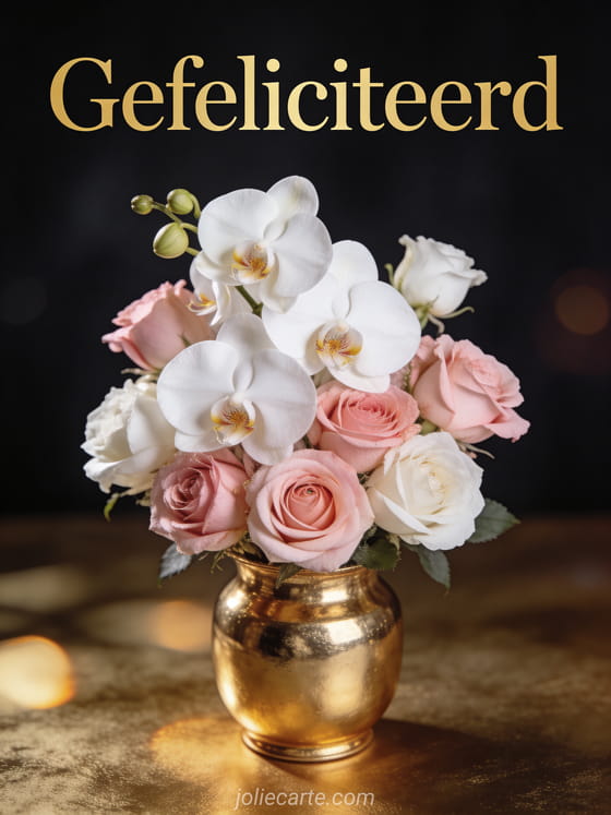 Deel deze fotorealistische kaart met orchideeën en rozen in een gouden vaas op een donkere elegante achtergrond. Bekijk ook vriendschap vriendin vriendschap gefeliciteerd vrouw, roos voor verjaardag vrouw en afbeelding gefeliciteerd vrouw gratis.