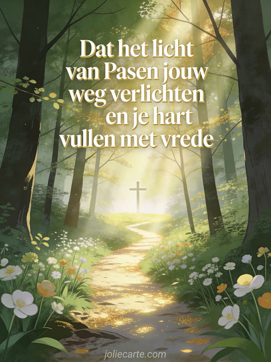 Stuur een contemplatieve christelijke paaskaart met een verlicht bospad dat leidt naar een open plek vol goddelijk licht, en een discreet kruis zichtbaar tussen de bomen. Ontdek ook een religieuze pasen afbeelding of een christelijke pasen kaart.