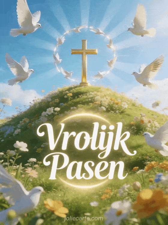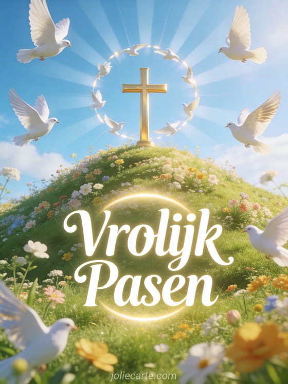 Stuur een prachtige christelijke paaskaart met een gouden kruis op een bloeiende heuvel en witte duiven in een stralend blauwe hemel. Ontdek ook een religieuze paaskaart of een religieuze pasen afbeelding.